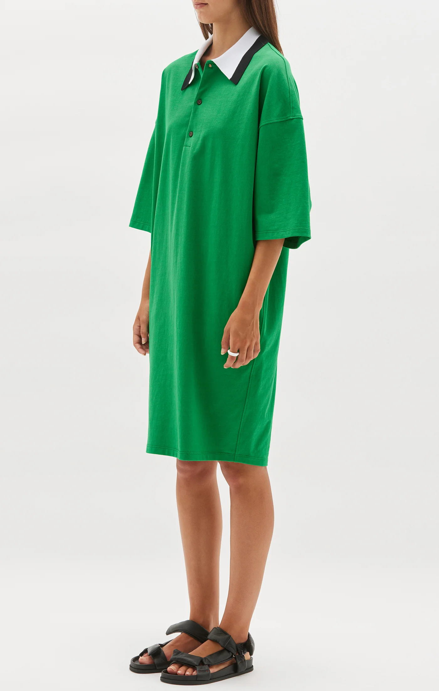 A relaxed fit short sleeve polo dress in organic cotton double jersey. With front button and soft collar detailing.